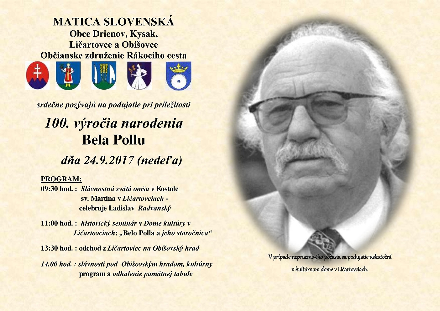 11:00 hod. – historický seminár v Dome kultúry v Ličartovciach – „Belo Polla a jeho storočnica: